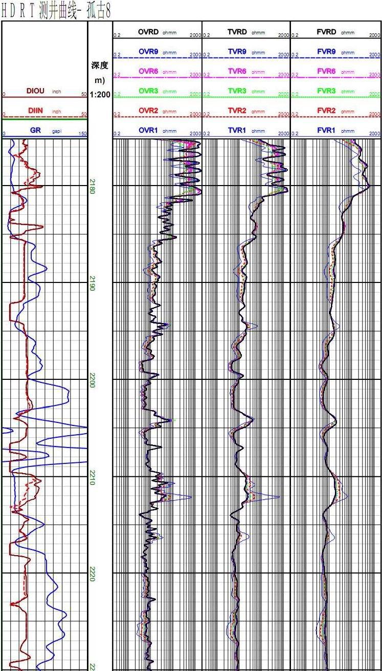 HDRT采用單發(fā)射線圈,7接收線圈,6個工作頻率,得到84道地層原始測量信號和12個儀器工作狀態(tài)監(jiān)督測量信號。經(jīng)過預(yù)處理、趨膚效應(yīng)校正、自適應(yīng)井眼校正和軟件聚焦等數(shù)據(jù)處理,輸出1英尺、2英尺和4英尺3種縱向分辨率,探測深度分別為6英寸、10英寸、20英寸、30英寸、60英寸、90英寸和120英寸的7種電阻率曲線,適用于多種復(fù)雜非均勻地層的測井需要,能有效識別油氣層,確定油氣儲量。