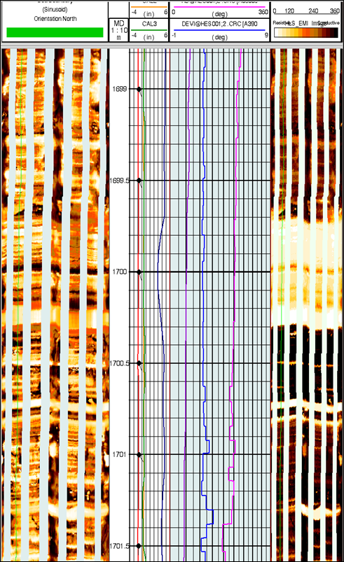 下圖是WDSC測得某井段資料的處理圖像成果:可見沿南北方向井眼的裂縫把井眼分成兩部分并且砂泥巖界面清晰。