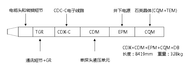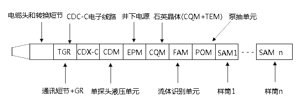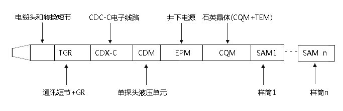 CDC-C型地層測試器是由多個模塊組成的地層測試器,根據(jù)測井要求進(jìn)行靈活組合。本系統(tǒng)可以完成應(yīng)變壓力、石英晶體壓力、流體溫度的測量,利用泵抽排模塊和流體分析模塊,通過電阻率、持水率和密度的測量,可以實(shí)時進(jìn)行井下流體分析,以達(dá)到取得地層真實(shí)流體目的,可以用氣墊進(jìn)行常規(guī)取樣,也可以利用泵抽排模塊采用水墊進(jìn)行PVT高壓取樣。主要由HH2530地面系統(tǒng)、CDX-C電子單元、CDM單探頭單元、EPM電源模塊(給CDM以下模塊供電)、CQM石英晶體模塊、FAM流體分析模塊、POM泵抽排模塊、SAM取樣模塊組成。SAM取樣模塊為氣墊緩沖和水墊泵抽排擠入,兩種方式取樣。并防硫化氫(H2S).
